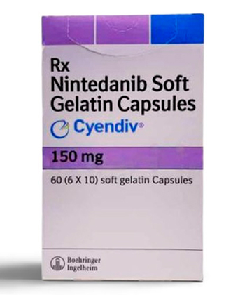 - Nintedanib este utilizat pentru tratamentul fibrozei pulmonare idiopatice. Medicamentul acționează ca un inhibitor al kinazei proteice.
